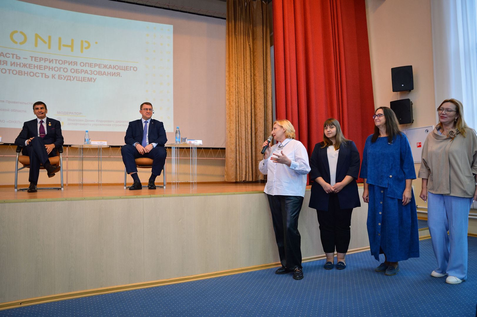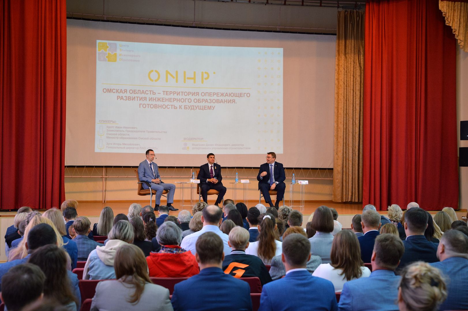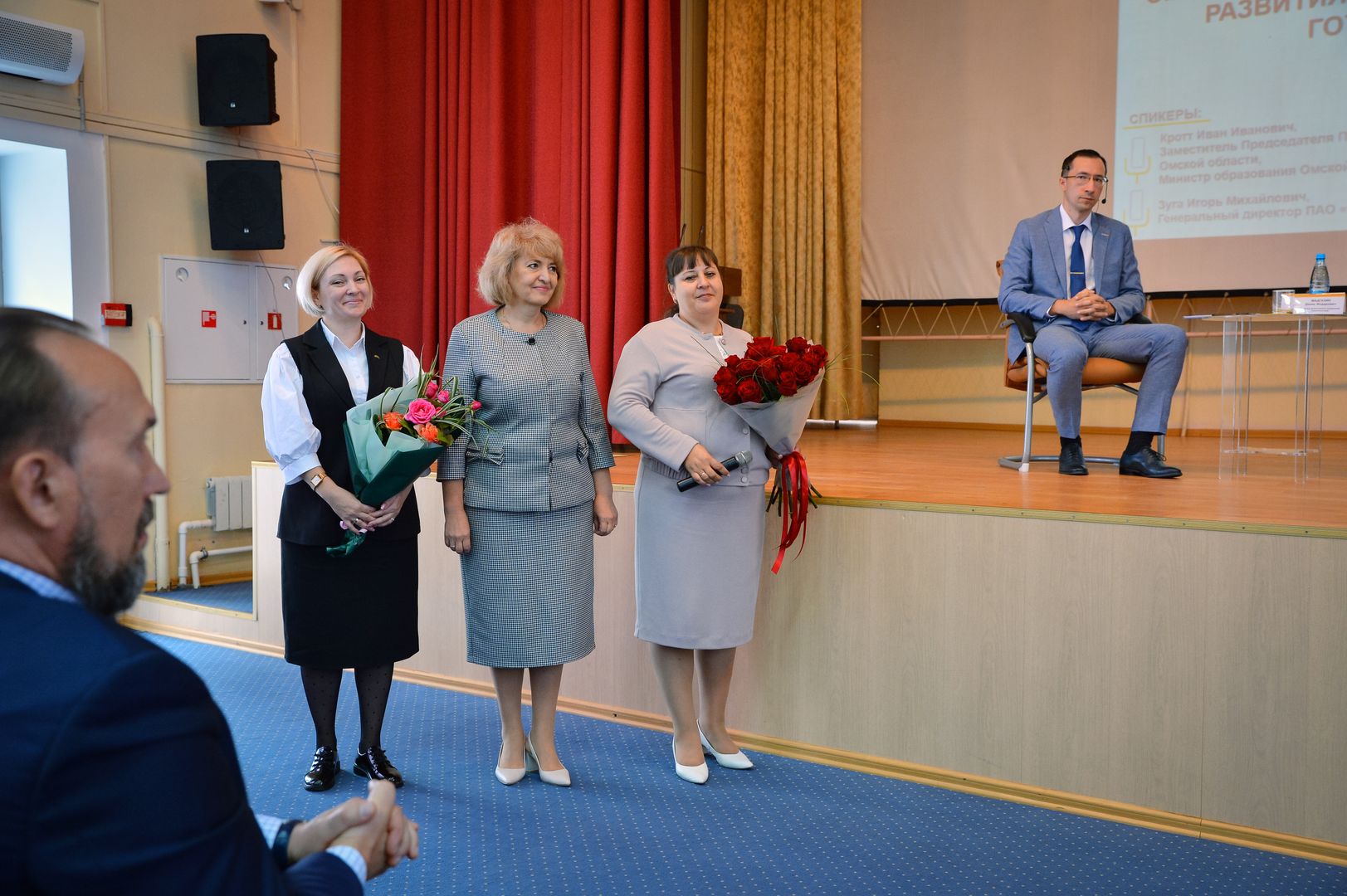 По окончании линейки в актовом зале ОНХП состоялась панельная дискуссия «Омская область – территория опережающего развития инженерного образования. Готовность к будущему» с участием спикеров -  Министра образования Омской области Ивана Ивановича Кротта и Генерального директора ПАО «ОНХП Игоря Михайловича Зуги.